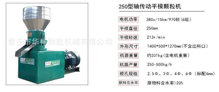 250型軸式飼料顆粒機:產量300-500kg/h,電機功率:15kw  6級