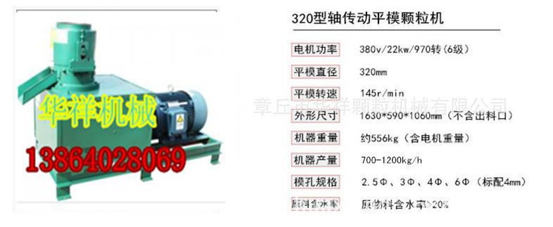 320型軸式顆粒機:產量300-1500kg/h,電機功率:22kw  6級