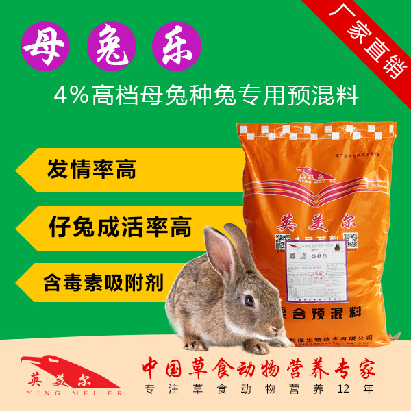 北京英美爾公司是一家專業化從事草食動物兔牛羊飼料營養研究的企業。公司針對母兔自身所需要的營養成分設計出合理的配方。節省草料,無需另加任何抗生素 類藥物,4%種母兔用復合預混料(母兔樂),針對影響種母兔繁殖力的各種因素 ,專門研制的一種新型無抗防霉除霉型綠色高效飼料添加劑 。能快速提高種母兔發情率、母兔配種率、降低母兔流產、減少母兔死胎,解決母兔奶水不足,提高仔兔成活率,增加仔兔斷奶窩重,預防斷奶前后仔兔拉稀、脹肚問題,保障兔群健康生長。高檔、綠色、除霉、長效型