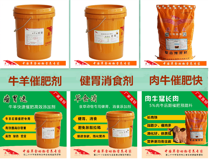 肉牛猛長肉(滿足肉牛催肥營養)+瘤胃素 (強度育肥劑 )+草食消(助消化劑 )
